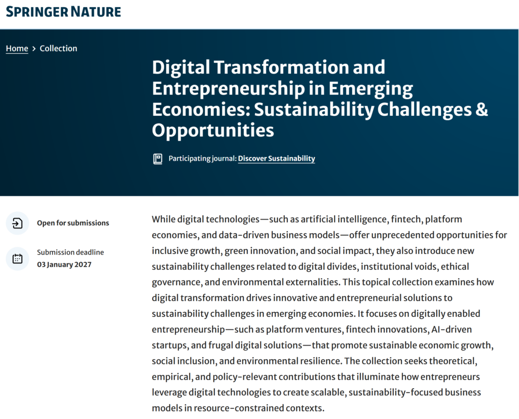 Wenn eure Forschung an der Schnittstelle von digitaler Innovation, Unternehmertum und Nachhaltigkeit in Schwellenländern liegt, kann ich eine Einreichung nur empfehlen. Das Journal ist Open Access, die Bearbeitungszeit ist kurz (im Median 17 Tage bis zur ersten Entscheidung) und die Deadline ist der 3. Januar 2027. Es bleibt also genug Zeit für einen starken Beitrag.