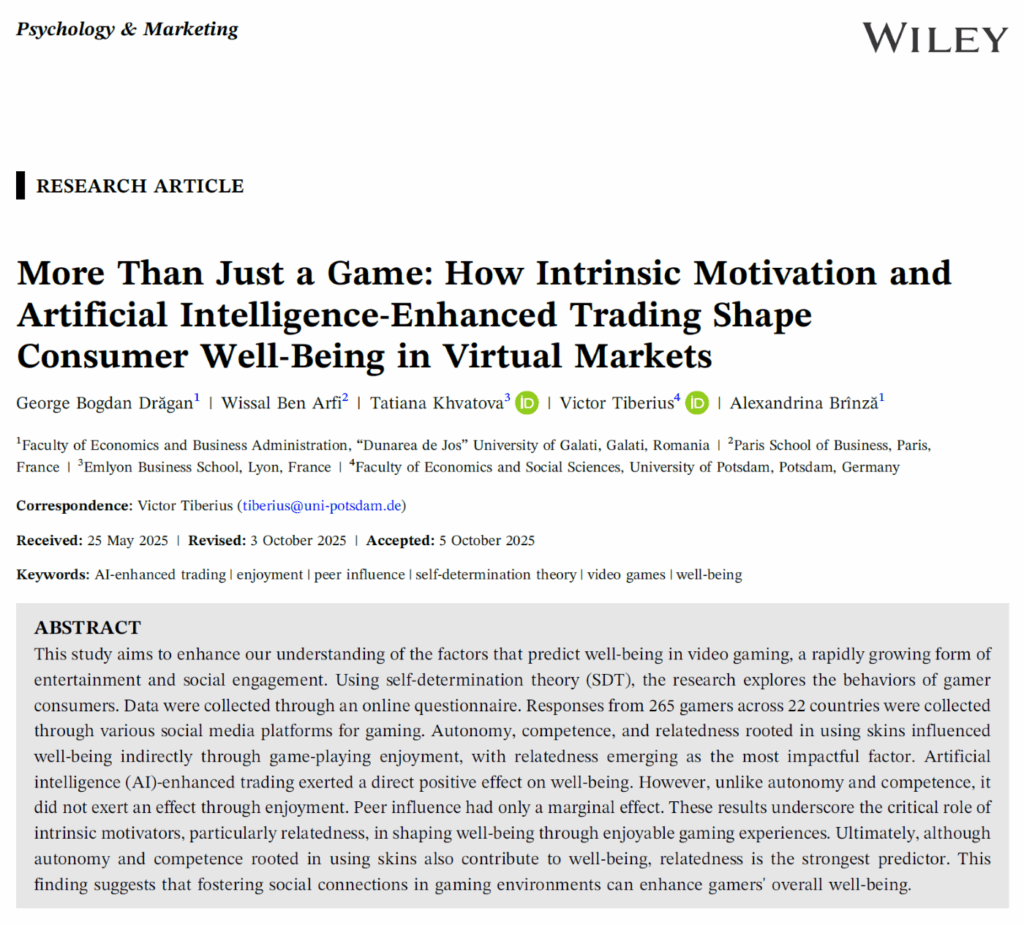 Drăgan, G. B., Ben Arfi, W., Khvatova, T., Tiberius, V., & Brînză, A. (2025). More than just a game: How intrinsic motivation and AI-enhanced trading shape consumer well-being in virtual markets. Psychology & Marketing, in press. doi:10.1002/mar.70065