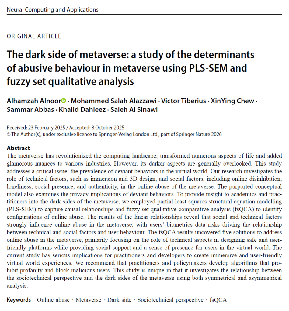 Alnoor, A., Alazzawi, M. S., Tiberius, V., Chew, X., Abbas, S., Dahleez, K., & Al-Sinawi, S. (2026). The dark side of metaverse: a study of the determinants of abusive behaviour in metaverse using PLS-SEM and fuzzy set qualitative Analysis. Neural Computing and Applications, 38, 266. doi:10.1007/s00521-025-11794-2